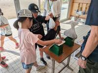こちらは5年生。天草拓心高校マリン校舎のご協力でマダイとクルマエビの稚魚稚エビ放流です。