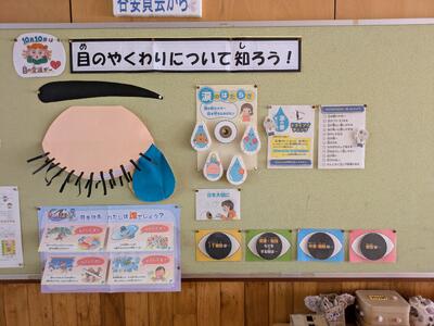 目の役割についてです。立体的で見たくなる掲示、ステキです。目は大切にしたいですね。◯眼が進んできて、つくづく思います。一学期に眼科検診の結果がお伝えしてありますね。まだのご家庭は眼科通院もお願いします。