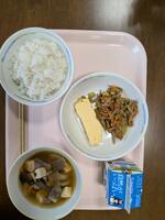 今日の給食です。おいしくいただきました。のっぺい汁、ごぼうのきんぴら、卵焼き。The和食。最高でした。