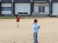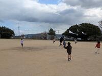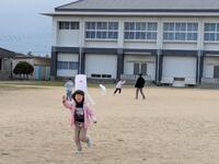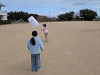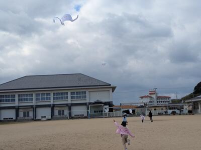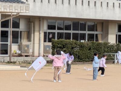 1年生が凧揚げをしていました。とっても楽しそう。みんなで運動場をいっぱい使って走っていくうちに凧がたかーくあがっていきます。