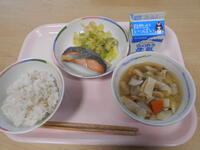 今日の給食は「はじまりの給食」です。塩鮭、栄養すいとん汁、漬物和えでした。
