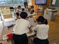 5年生の様子です。ひし形の面積の求め方をボードを真中において、各グループで一生けん命考えていました。