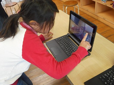 2年生は授業で初めてタブレットを使いました。操作も戸惑うことなく、扱っていました。3枚目の写真は自分の質問や感想をタブレットで録画している所です。