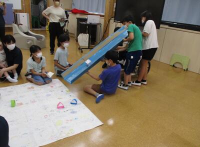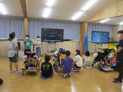 すごろくゲームが終わると、次は〇×ゲームと宝探しゲーム。富岡小学校に関する問題を支援学校の子供たちに考えてもらい、正解すると宝が隠されている場所のヒントが出されていきます。宝は、子供たちが作った折り紙やお手紙などで、宝を手にした支援学校の子供たちもとても喜んでいました。最後は、感想を交流し合いました。お互いのことを知り、一緒に活動する喜びを感じることのできた時間でした。