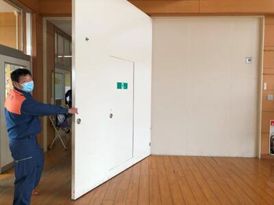 最後に、お礼の言葉を述べて避難訓練終了。今回は、1階の防火扉を閉め、その扉の役割や使い方についても説明していただき、教室に帰るときに扉を通る体験もすることができました。