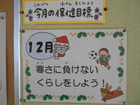 12月の保健目標は「寒さに負けない暮らしをしよう」です。その他にも子どもたちがぜひ触ってみたくなるような仕掛けが・・・。元気に過ごすための『アドベントカレンダー』です。ちなみにアドベントとは、準備期間ということで、クリスマスまで気持ちを高めて行く準備、待ち望む準備なども含まれるそうです。