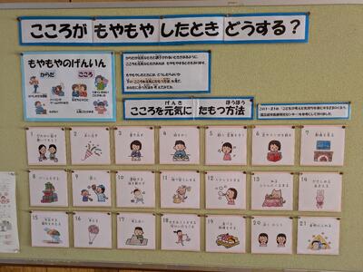 もやもやは年齢、男女問わずありますよね。子どもたちもそうだと思います。自分のこころをいろんなきっかけで一歩前へ半歩前へでいいと思います。掲示を眺めながら思ったところでした。ちなみに私は2.10.20の方法かなあ。