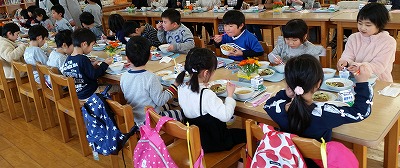 今日は新一年生の体験入学で、いっしょに給食試食会を行いました。新1年生も現1年生も相乗効果でみんなおいしそうに食べました。野菜はどうだったかな?