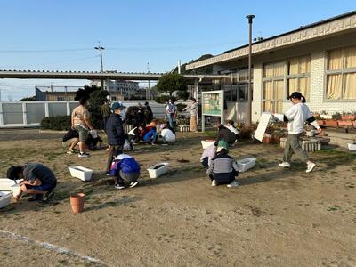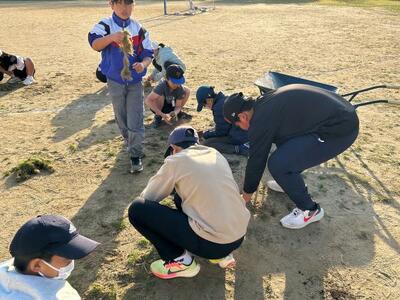 鉢やプランターの片付けが終わると、子供たちは運動場の草取りを始めました。今年度、クリーンタイム等での子供たちの姿を見ると、進んで植物の水やりや草取りを行うようになったなと子供たちの成長を感じます。これも、人権の花運動の取組の成果だとうれしく思います。これからも、引き続き美しい学校目指して頑張ってほしいと願っています。