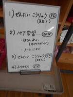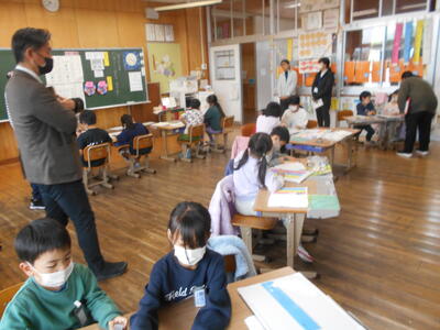 今日は、他の職員も参観して子どもたちの学びの環境について実際の授業を見ながら考えていく機会としています。1年生の先生に複式学級の担任、2年生の先生に支援の先生という役割設定でシュミレーションも含めて、できるだけ次年度に近い環境で行いました。