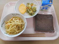 今日の給食です。クリームパスタ ココアパン コールスローサラダ トマトオムレツでした。