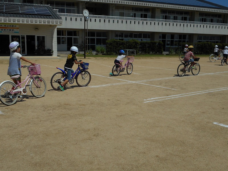 延期になっていた3年以上の交通教室を実施しました。運動場内のコースを自転車で運転したり、校外に出て実際に左右確認や一時停止をして乗り方を確認しました。個々の技術を知ることができました。3年の中には自転車の左側通行を知らない子どももいて、夏休み前に実施してよかったと感じました。