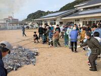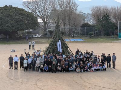 高く燃え上がりました。「鬼火焼き」は、正月飾りに宿った「鬼(悪霊)」を追い払い、火にあたって餅を焼いて食べ、新年の「無病息災・家内安全・五穀豊穣」などを祈願する意味があります。炎と煙、そして竹の破裂音で厄を払い清める、厄払いの意味もあるそうです。特に天草では、1年間しめ縄を飾る歴史的な慣習があり、そのしめ縄を燃やして厄払いする風習がとても残っていますね。