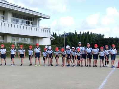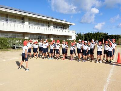 開会式が終わると、低学年の子供たちはウォーミングアップを始めます。中・高学年の子供たちは児童玄関前で声援を送ります。