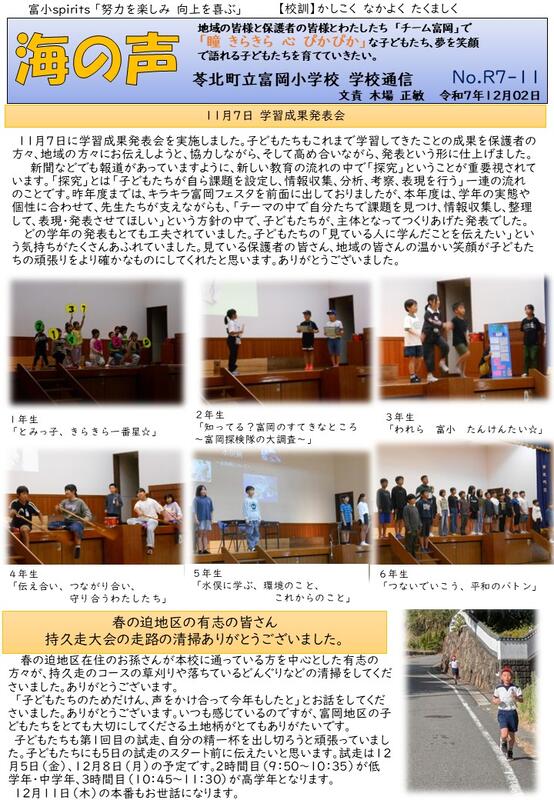 今日は午後冷えましたね。いよいよ冬ですね。苓Pレクレーションお疲れ様でした。昨日発行の学校通信「海の声11号」です。