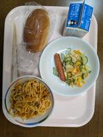 今日の給食は、これです。給食アンケート第8位のスパゲッティでした。他にはミルクパン、シーザーサラダ、ウィンナーです。イタリアン的な給食でした。おいしくいただきました。