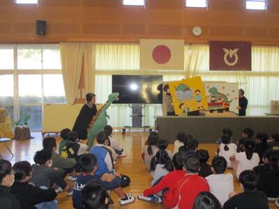最後のお話は、「へっこきあねさが よめにきて」。これも大がかりな舞台が準備されていました。まずは、尺八の演奏でスタート。大きな背景画や精巧な大道具・小道具、マリオネット(あやつり人形)の巧みな動きに、子供たちも(職員も・・・)わくわくしながらお話の世界に引き込まれていきました。