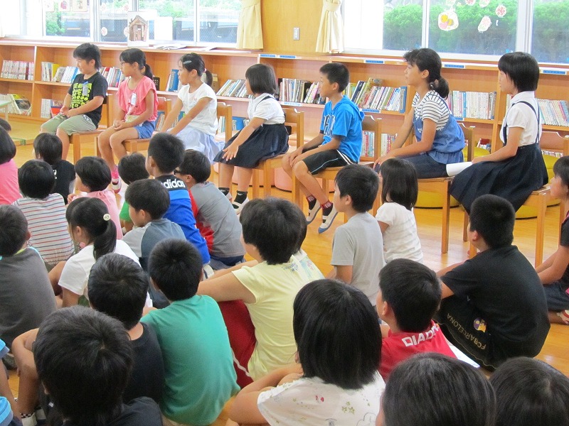 学級代表の7人が緊張しながらも4~7分のお話をしてくれました。最後に、登場人物など聞いてみるとすぐに答えが返ってきました。しっかり聞いただけでなく、伝える代表のお話が上手だったということがわかります。夏休みは土日祭日以外は図書室は開放します。どんどん借りに来てください。