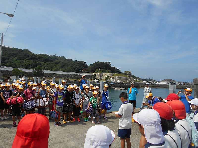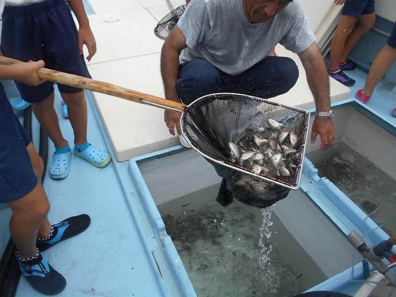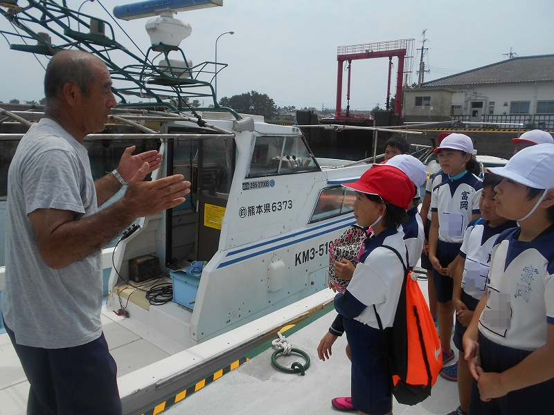 地域の方の協力を得て実施している5年の稚魚放流。苓北では37000匹の放流です。その中で生魚になるのは2%と聞いて驚きました。育てる漁業の目的を聞いて放流に熱が入りました。