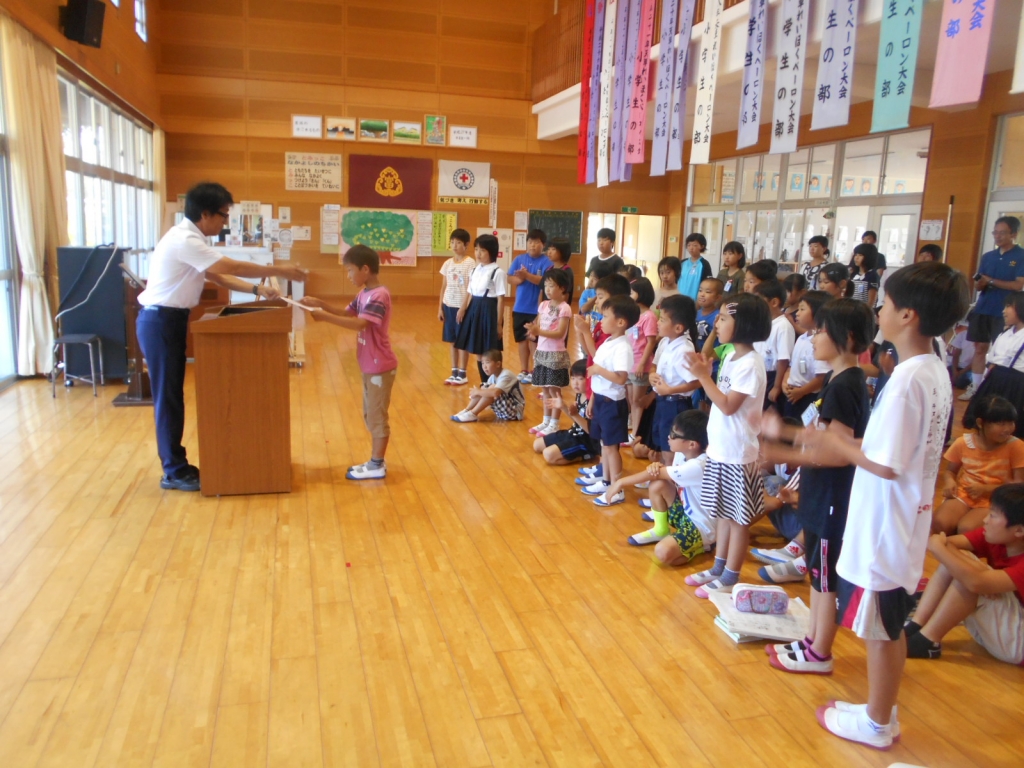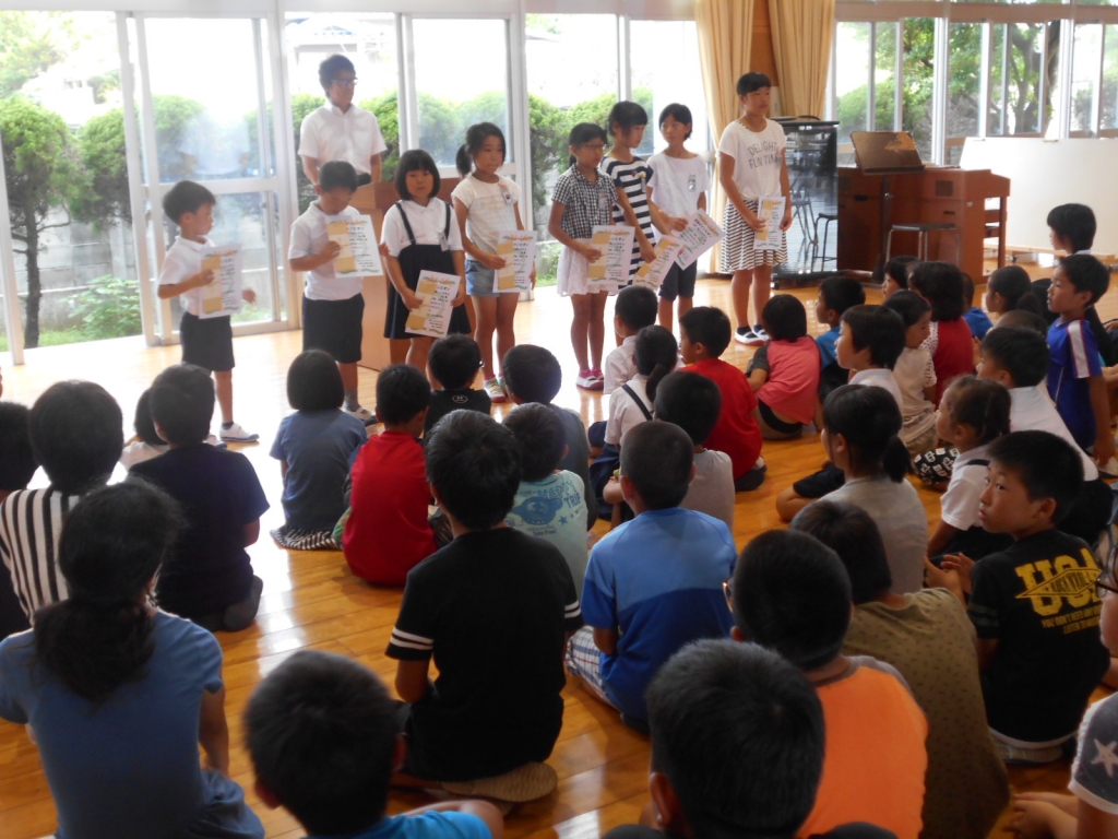 7月19日には漢字大会、計算大会の表彰、終業式の20日は各学年の童話発表会代表、読書チャンピオンの表彰がありました。自分のがんばりに満足そうな顔です。2学期もがんばってほしいです。