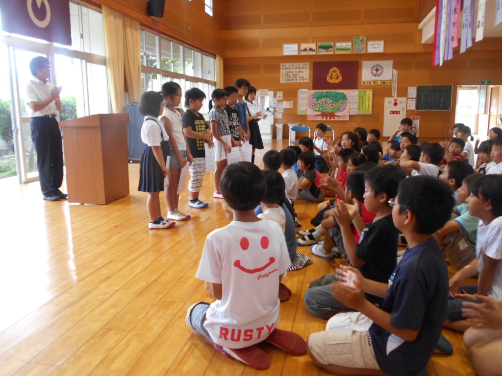 終業式では、各学級の代表が1学期の反省を発表しました。自分自身の成長をしっかりとらえて頼もしく感じました。また、校長先生からの命を大切にするお話を真剣に聞きました。