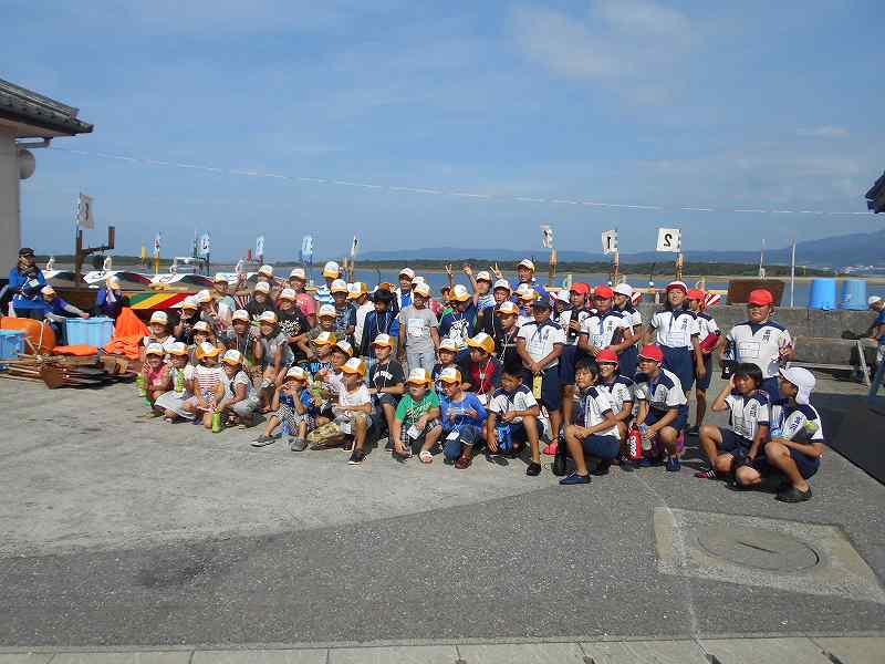 晴天の23日、苓北じゃっと祭実行委員会より招待された益城町の1~6年40人と富岡小6年15人がペーロン体験を行いました。