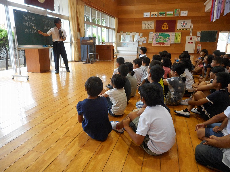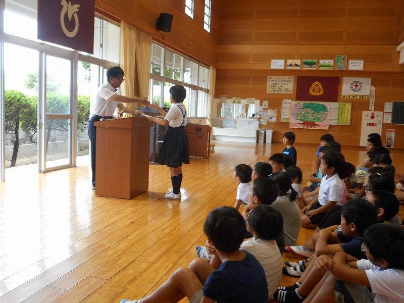 1時間目は始業式です。夏休みの表彰から始まり、各学年の代表が夏休みの思い出や2学期にがんばることを発表しました。