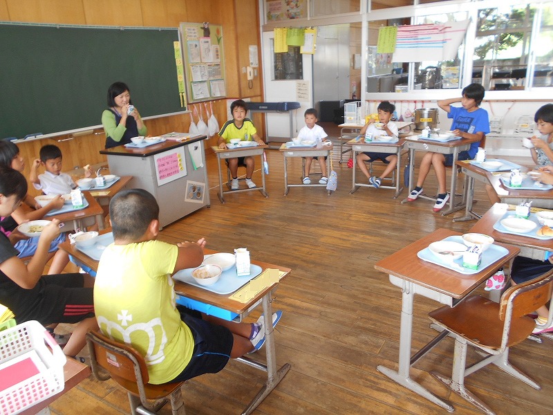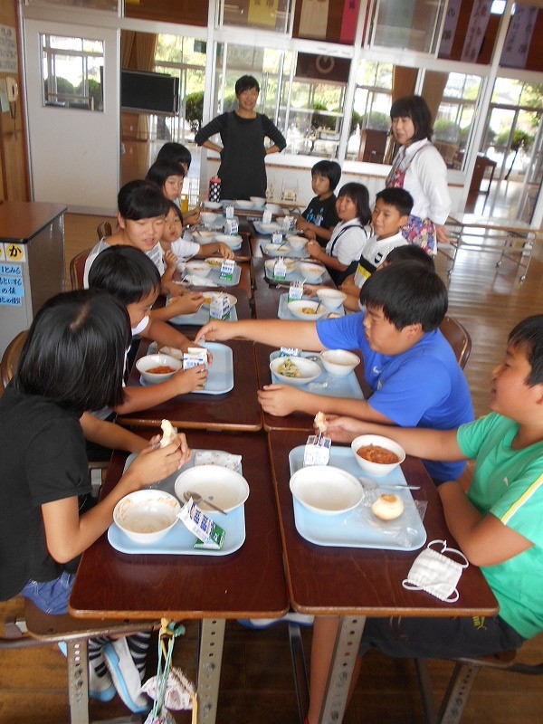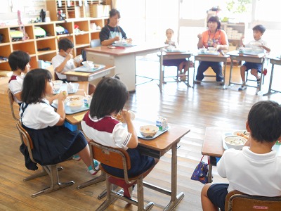 今日は、他学年との交流を主として、食への関心、マナーの向上を図るためにふれあい給食を実施しました。1年と6年、2年と4年、3年と5年の半数ずつが教室を入れ替え、食べます。上学年の食べっぷり見習ったり、上学年がお世話したりとよい交流ができました。ある教室では上学年より下学年が早く食べてしまうこともありました。