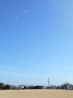 朝の厳しい寒さから一変、絶好のたこあげ日和です。1年生の声に誘われ覗いてみると、相当な高さまで上がっています。やっぱり・・・風の強さからか、手を離したこが行方不明になりました。どこかに舞い落ちていたらすみません。もつれることもあり、1年の笑顔とは対照に担任は必死でした。