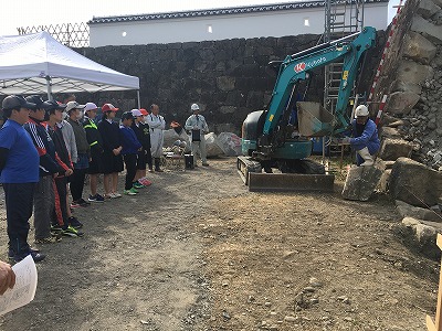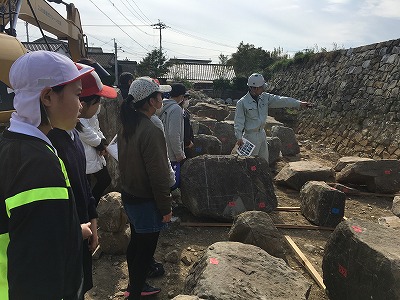 苓北町では富岡城の大手門の整備を行っています。地元の富小6年生に見学のお声がかかりました。