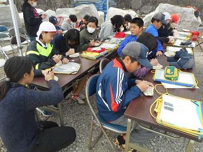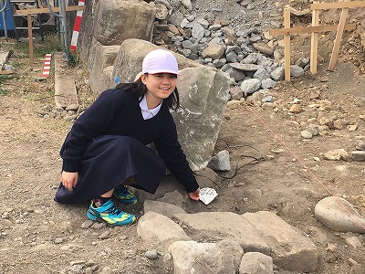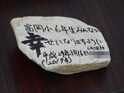 天草の歴史と富岡城について学び、実際に堀の深さ(高さ)8mを見学しました。整備の様子も教えていただきました。積み石の裏側におくグリ石に一人一人記念の願い事を書き、つめることになりました。6年生は得した気分です。