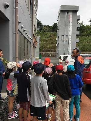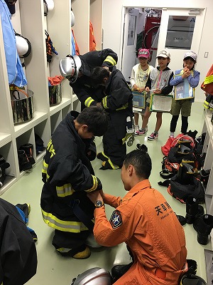 4年生は佐伊津にある天草広域連合中央消防署まで足を伸ばし、見学しました。写真にあるように、日頃できない体験をして、質問をたくさんしました。先日、苓北町で火災があったので、関心をもって学習ができたようです。見学後は、消防士になりたいという思いを持った男の子がいたそうです。