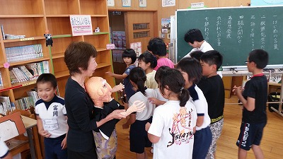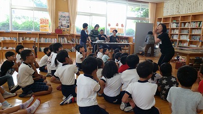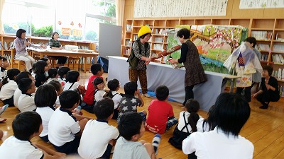 この日は、年に1回のお話集会です。9名の方々から、紙芝居、人形劇、手遊びうたなどを紹介していただきました。みんなお話に引き込まれ、笑顔いっぱいになりました。