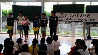 子どもたちは真剣です。①のまほうのあいさつについて企画委員会が示してくれました。