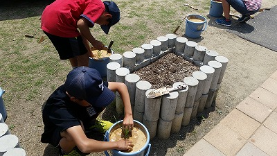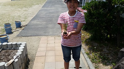 JAの方のご指導の下、今年もバケツ稲にチャレンジします。今日は、先日種をまいて成長した苗を植える日です。大切に持って丁寧に、丁寧に。学校田同様、収穫後の米を味わいたいですね。