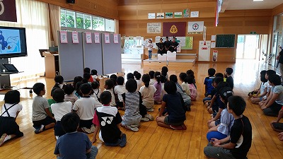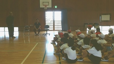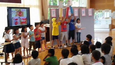 ミガクンジャーと1年生のコラボです。元気な歌声が響きました