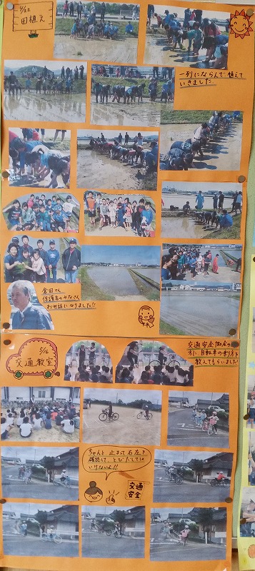 これから廊下のに掲示されている子どもたちの1年を紹介していきます。スナップ写真やイラスト、コメントなど手作りのよさを味わってください!T先生が作られています。