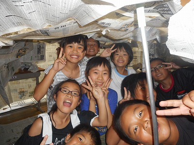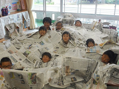 4年生が、6時間目「教室に来てください」伝えに来ました。行ってみると、教室が激変。5時間目の図工1時間で、新聞紙1か月分を使って巨大アートを作り上げました。その中で、かくれんぼ。一人一人を見つけていきました。