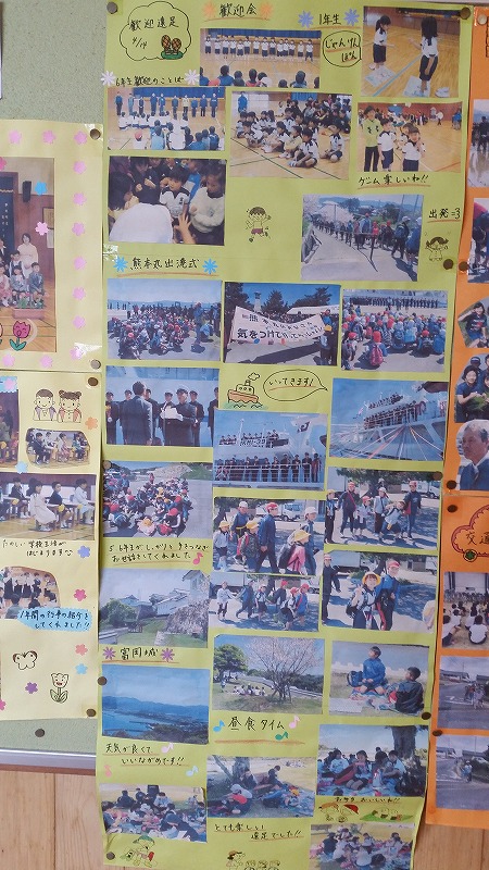 これから廊下のに掲示されている子どもたちの1年を紹介していきます。スナップ写真やイラスト、コメントなど手作りのよさを味わってください!T先生が作られています。