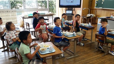 2年生の給食風景です。大型テレビにはタイマーがカウントダウンをしています。時間内に食べることを目標にしているのです。昨年に比べ、食も太くなりモリモリ食べています。