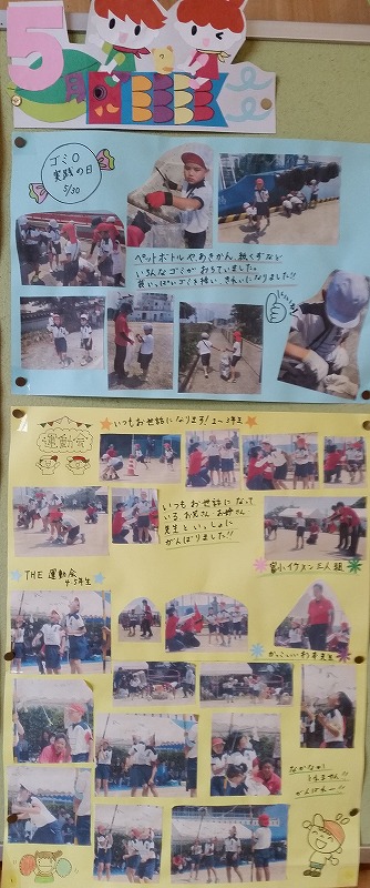 これから廊下のに掲示されている子どもたちの1年を紹介していきます。スナップ写真やイラスト、コメントなど手作りのよさを味わってください!T先生が作られています。