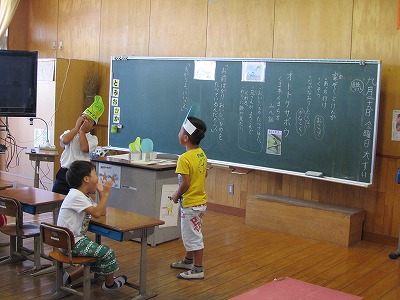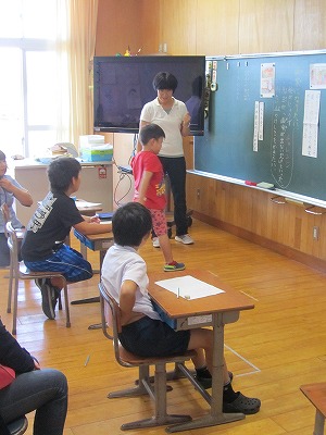 2年生は学習のまとめとして、音読劇を行いました。地の文(会話以外の文)をみんなが読んで、交代でかえるくんやがまくんを演じました。