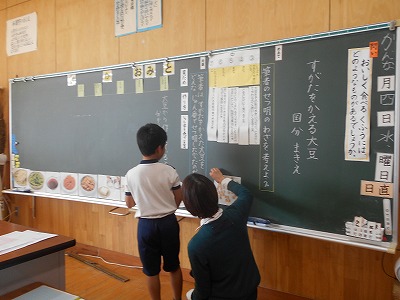 3年の国語科研究授業「すがたをかえる大豆」。おいしく食べる工夫についての学習から、筆者の構成の意図まで深く考えます。