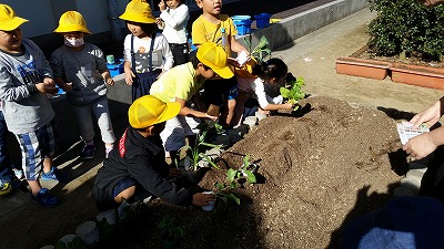 天気もよく、1年生は冬野菜植えにチャレンジ。ニンジン、大根は種から、チンゲンサイなどは苗からです。ニンニクを植えた1年生もいました。成長したら、私にもあげると約束してくれました。楽しみですね。