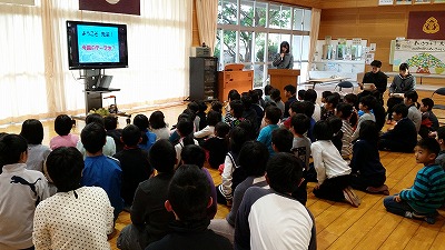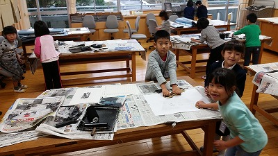 学習した「やまなし」のお話を紙芝居で1年生に紹介しました。相手意識があるので、読み方も丁寧でした。絵も上手でした。1年生の聴く表情がそれを物語ります。
