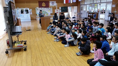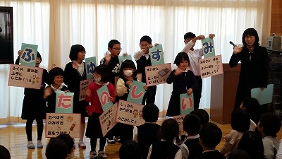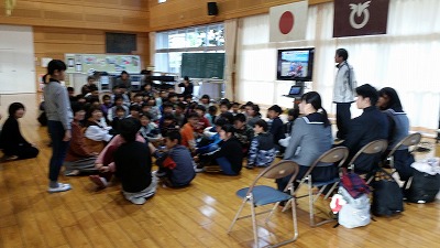 そして、校長先生の話。全員が目標を達成した自身からでしょう。寒い中ですがしっかり聞き入っています。最後に、冬休みのくらし。保健面では委員会と1年生のコラボでした。