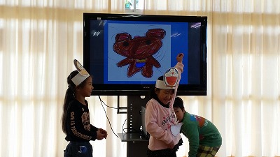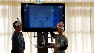 一人での発表でなく、のび太役、パソコン操作もあるので、友だちと協力しての発表です。意図的に仕組まれた先生のアイデアもよかったですね。