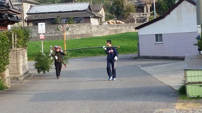 本日、29日午前9時からどんどやの準備です。5,6年生が集まりました。富小保護者OBの方の竹林から竹を運び出します。そして、富岡西港の広場で組み立てます。お父さん方の動き、技術は本当に心強いです。たくさんの方々にご協力いただきました。ありがとうございました。