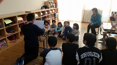 学習した「やまなし」のお話を紙芝居で1年生に紹介しました。相手意識があるので、読み方も丁寧でした。絵も上手でした。1年生の聴く表情がそれを物語ります。