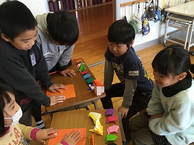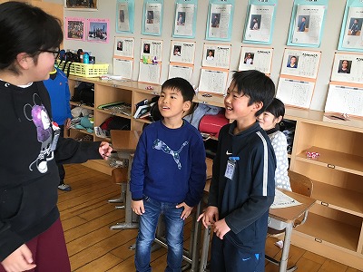 5年生が下級生を招待して、これまで学習したことをゲームを通して伝えます。今日は3年生を迎えました。3年生は英語に関心があり、楽しく積極的に学習できました。次年度からの楽しみが増えたようです。